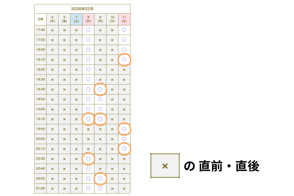 ご予約の際は、” 可能な範囲 ” で構いませんので、枠を詰めて(「×」の直前・直後の枠を選んで)ご予約いただけますと嬉しいです。