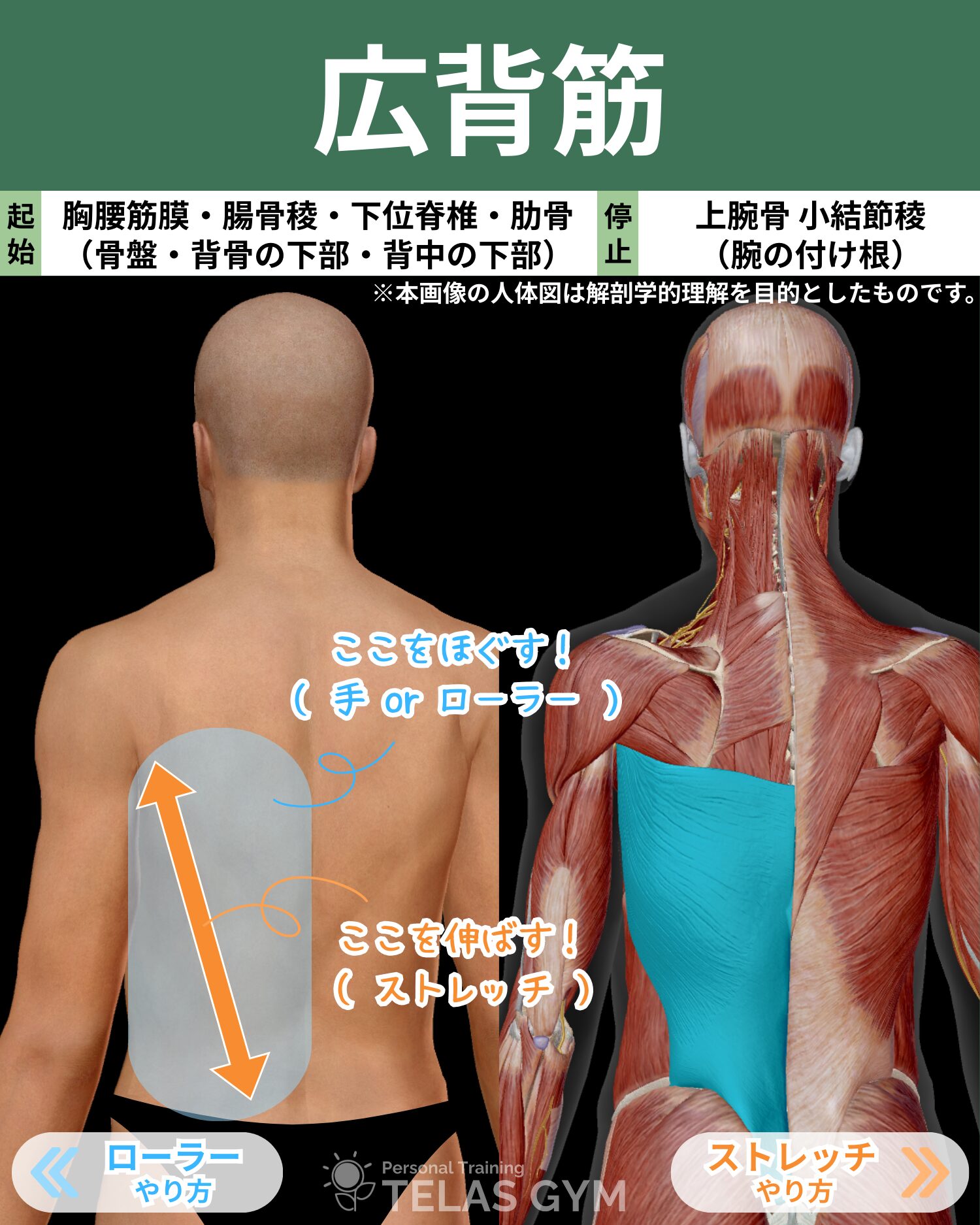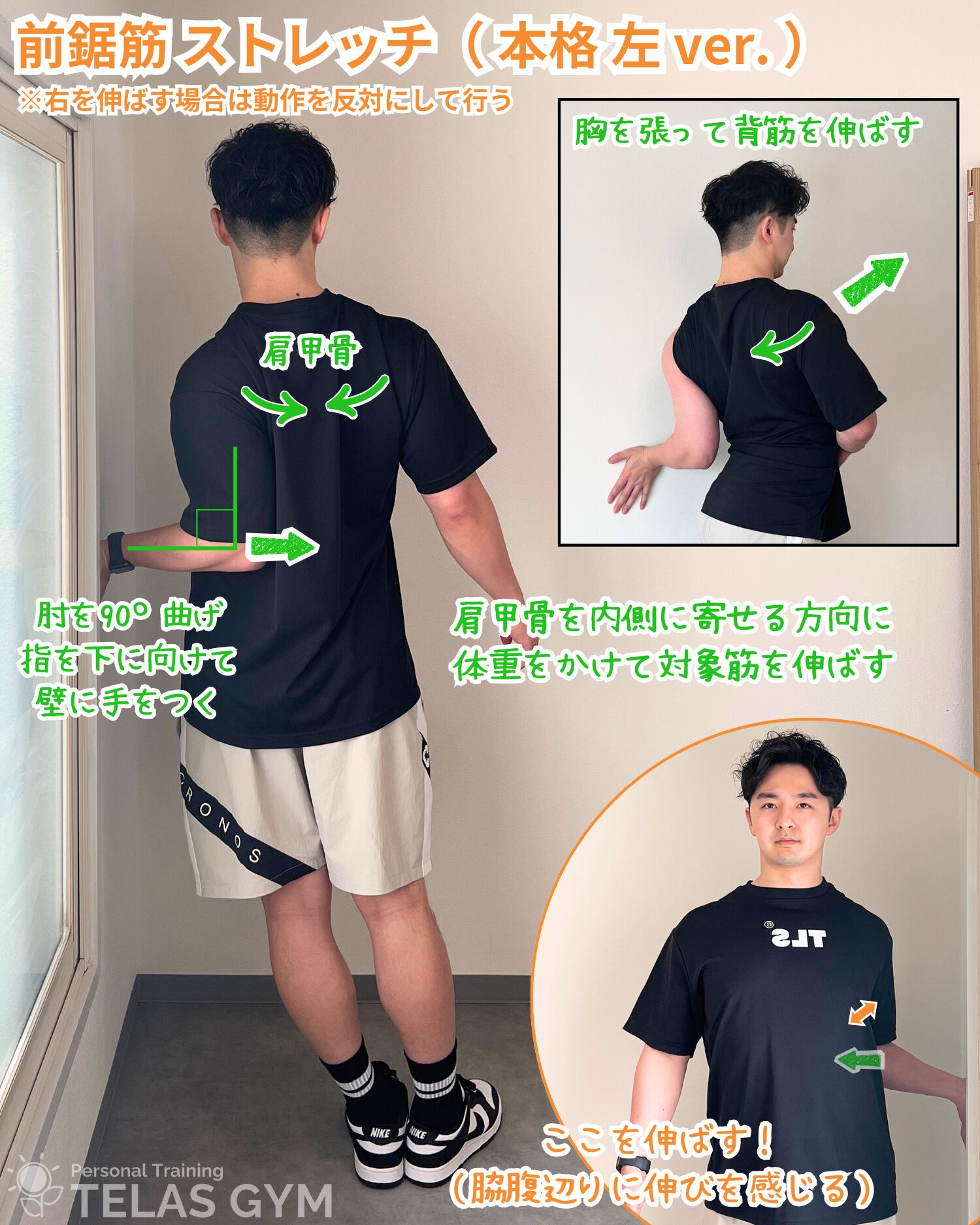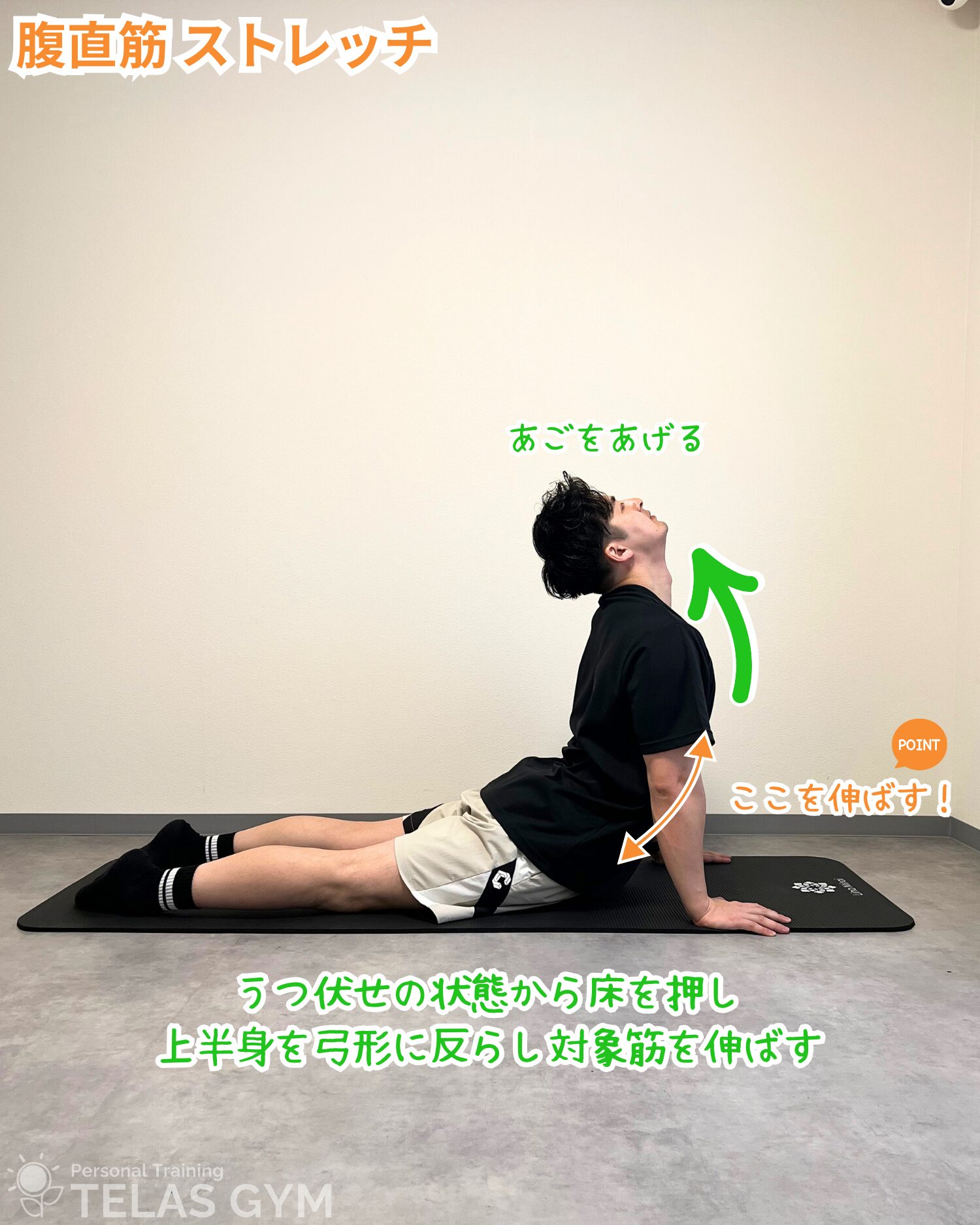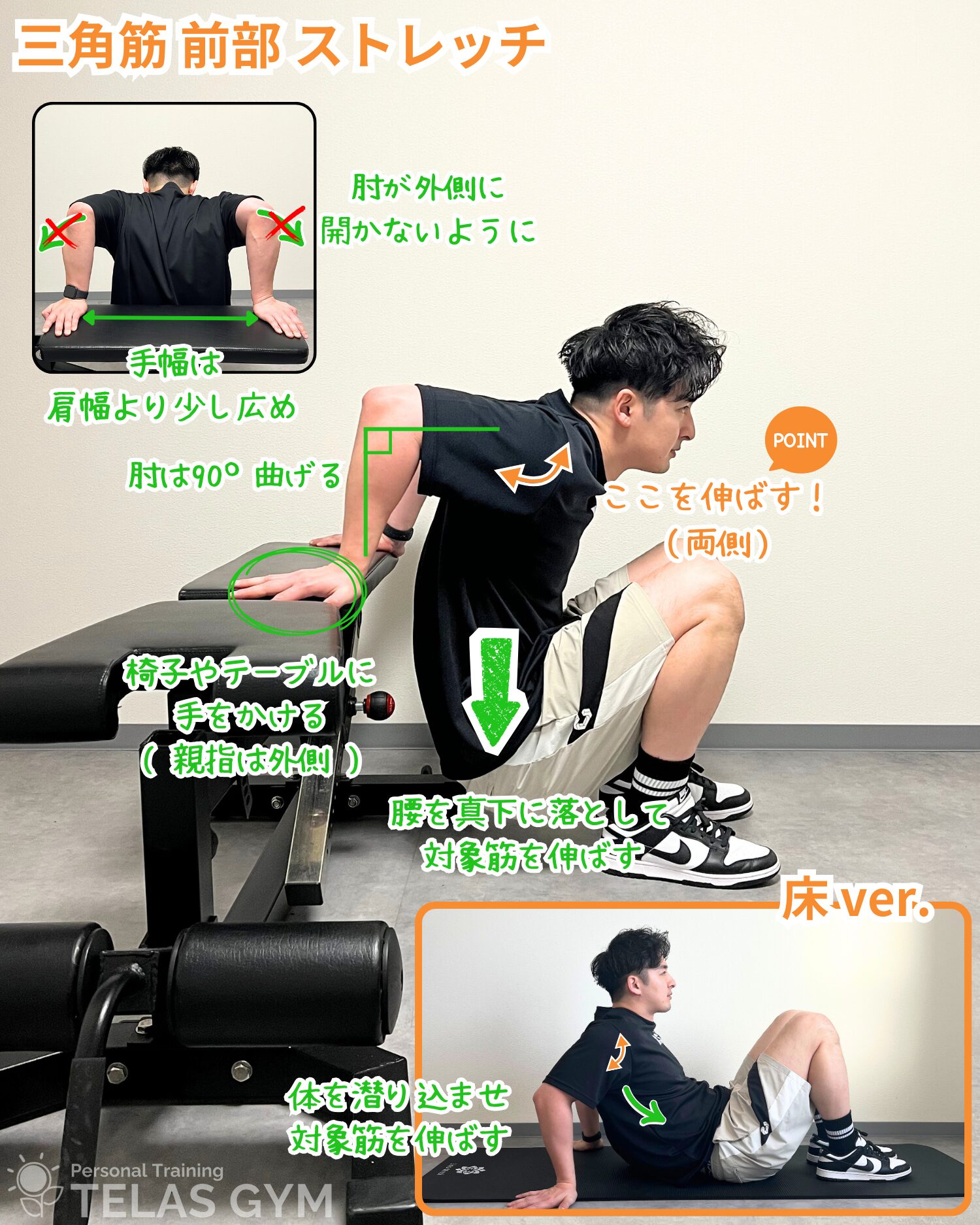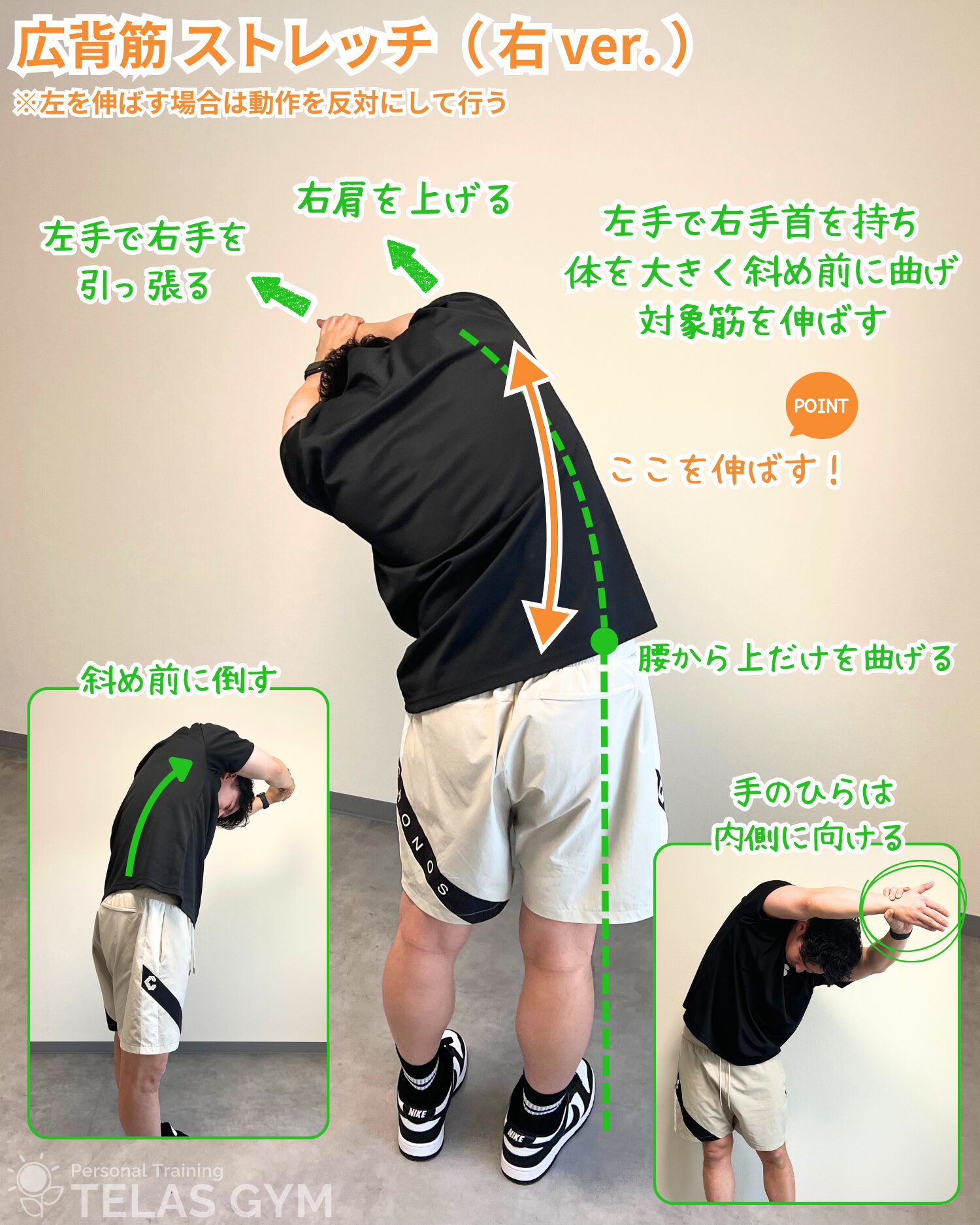 ※テラスジムでトレーニング前に行うストレッチは、対象筋のトレーニング効率を最大化するため、拮抗筋や邪魔な筋肉をしっかり緩めることが目的であるため、その限りではありません。