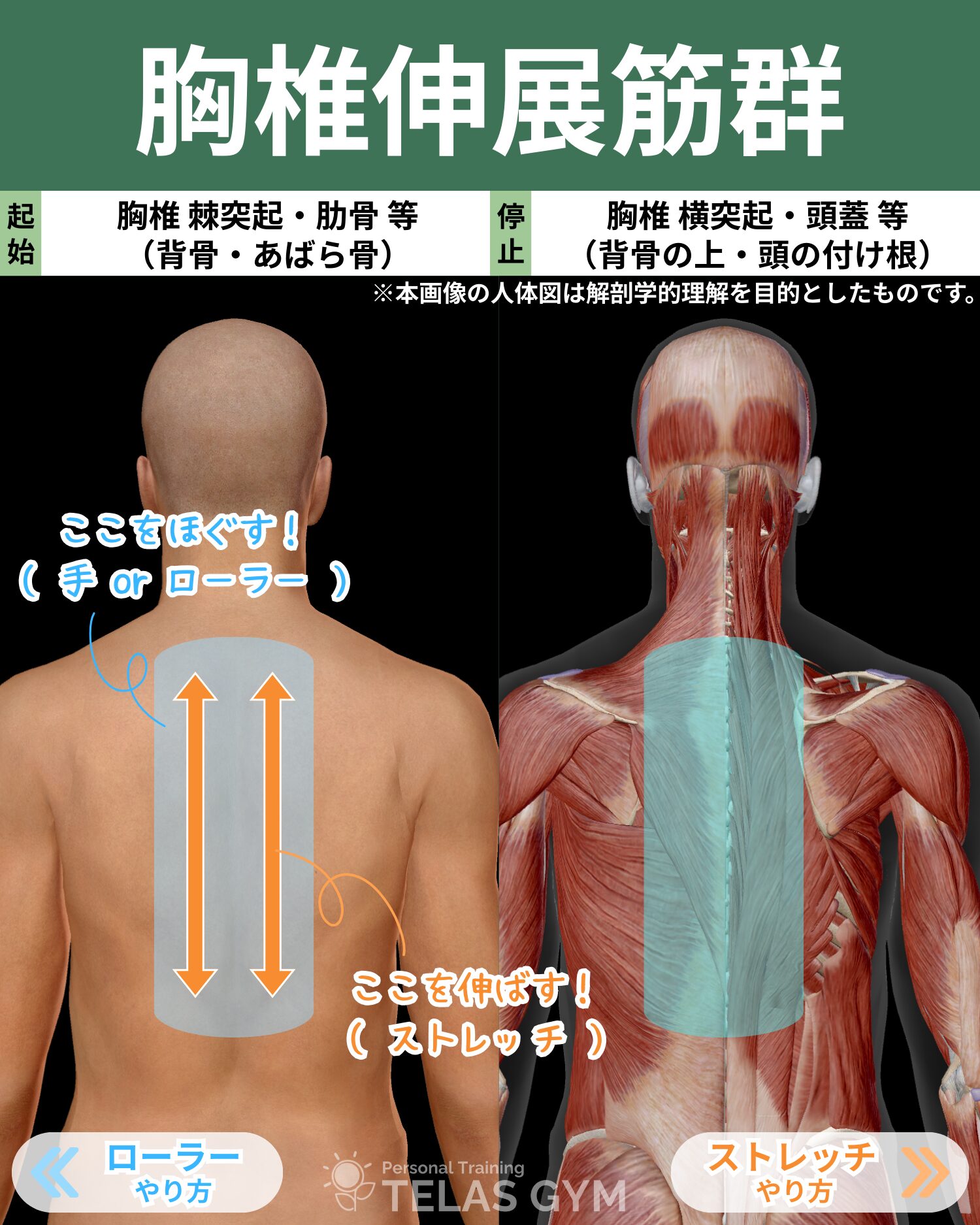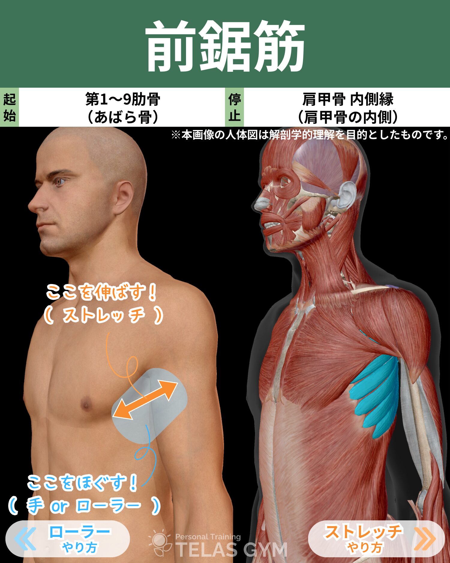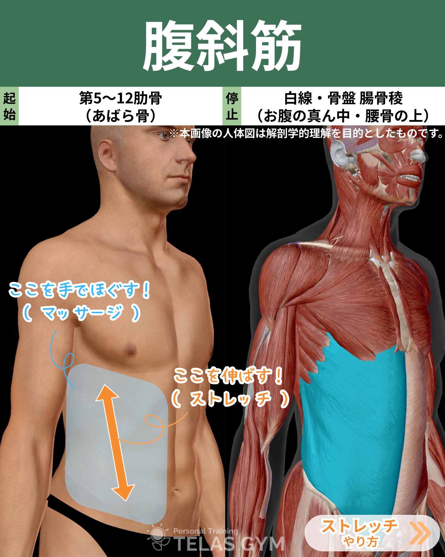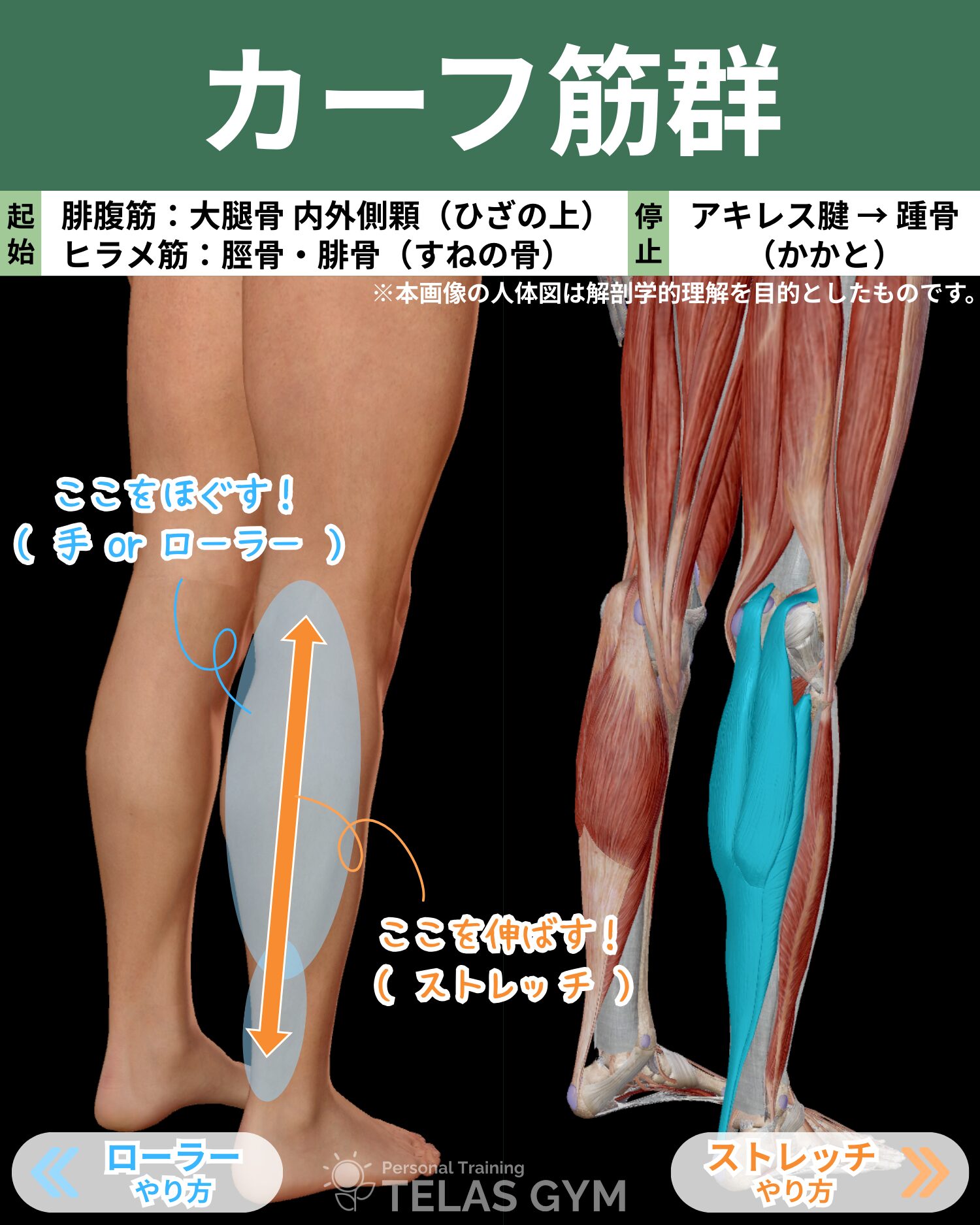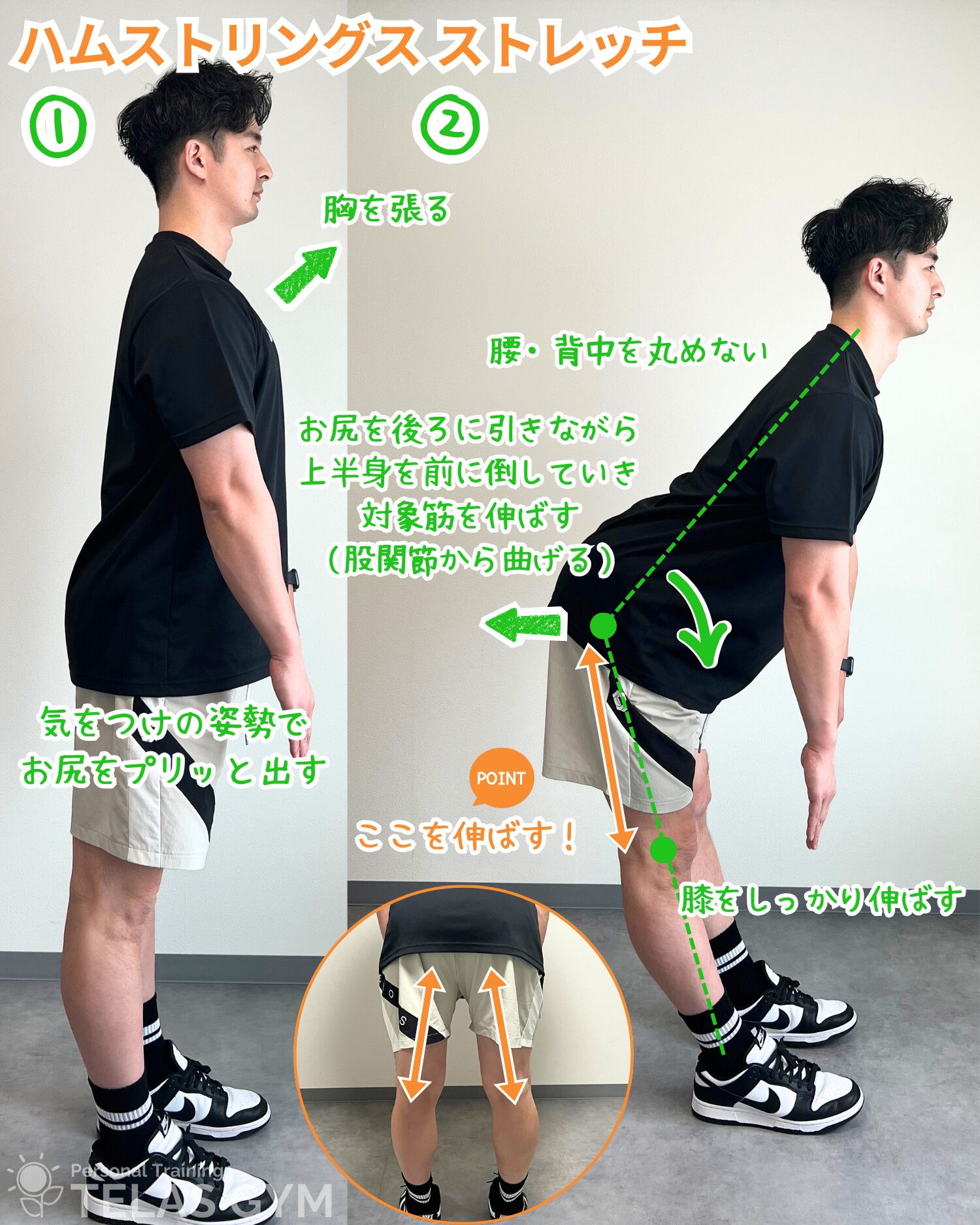 ※テラスジムでトレーニング前に行うストレッチは、対象筋のトレーニング効率を最大化するため、拮抗筋や邪魔な筋肉をしっかり緩めることが目的であるため、その限りではありません。
