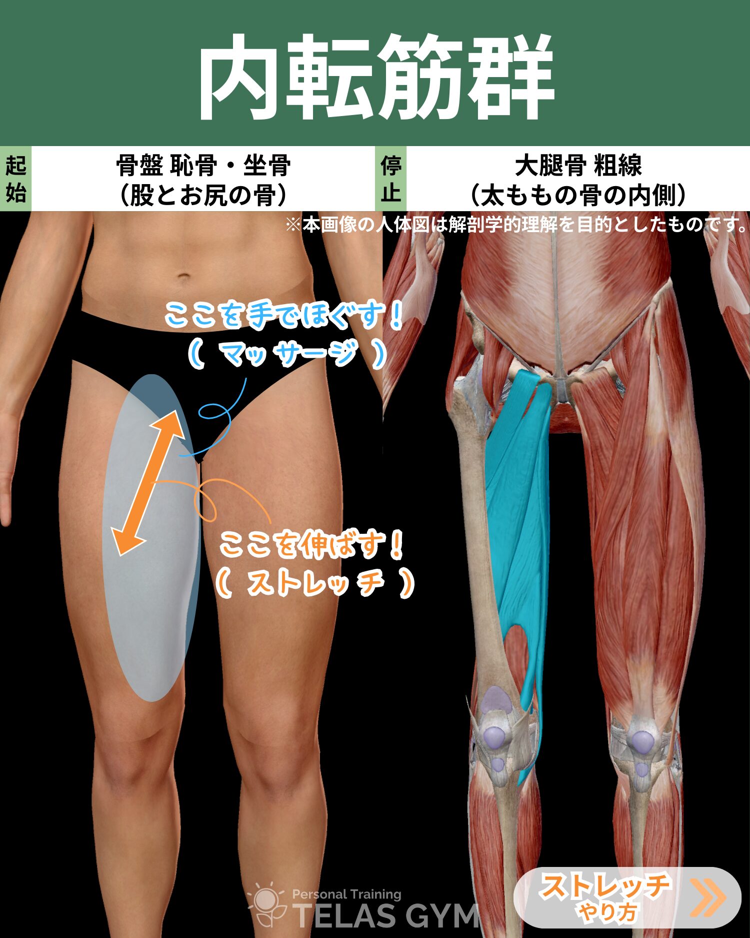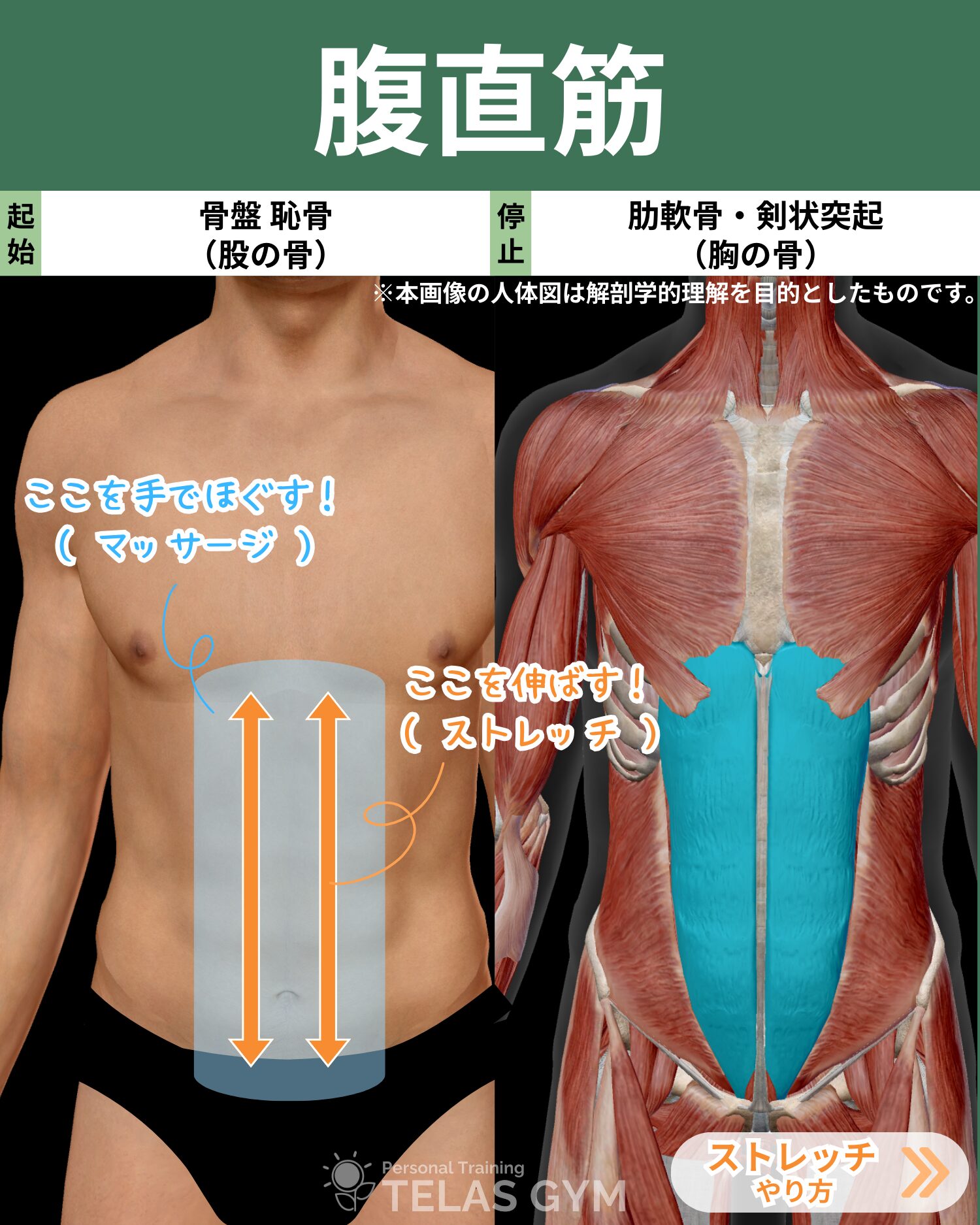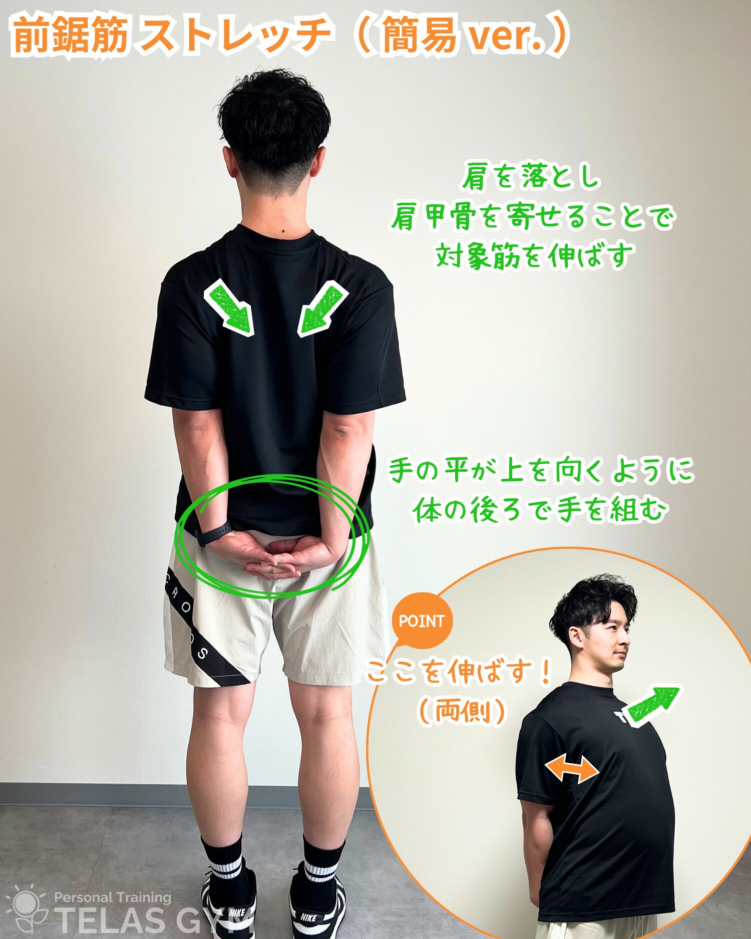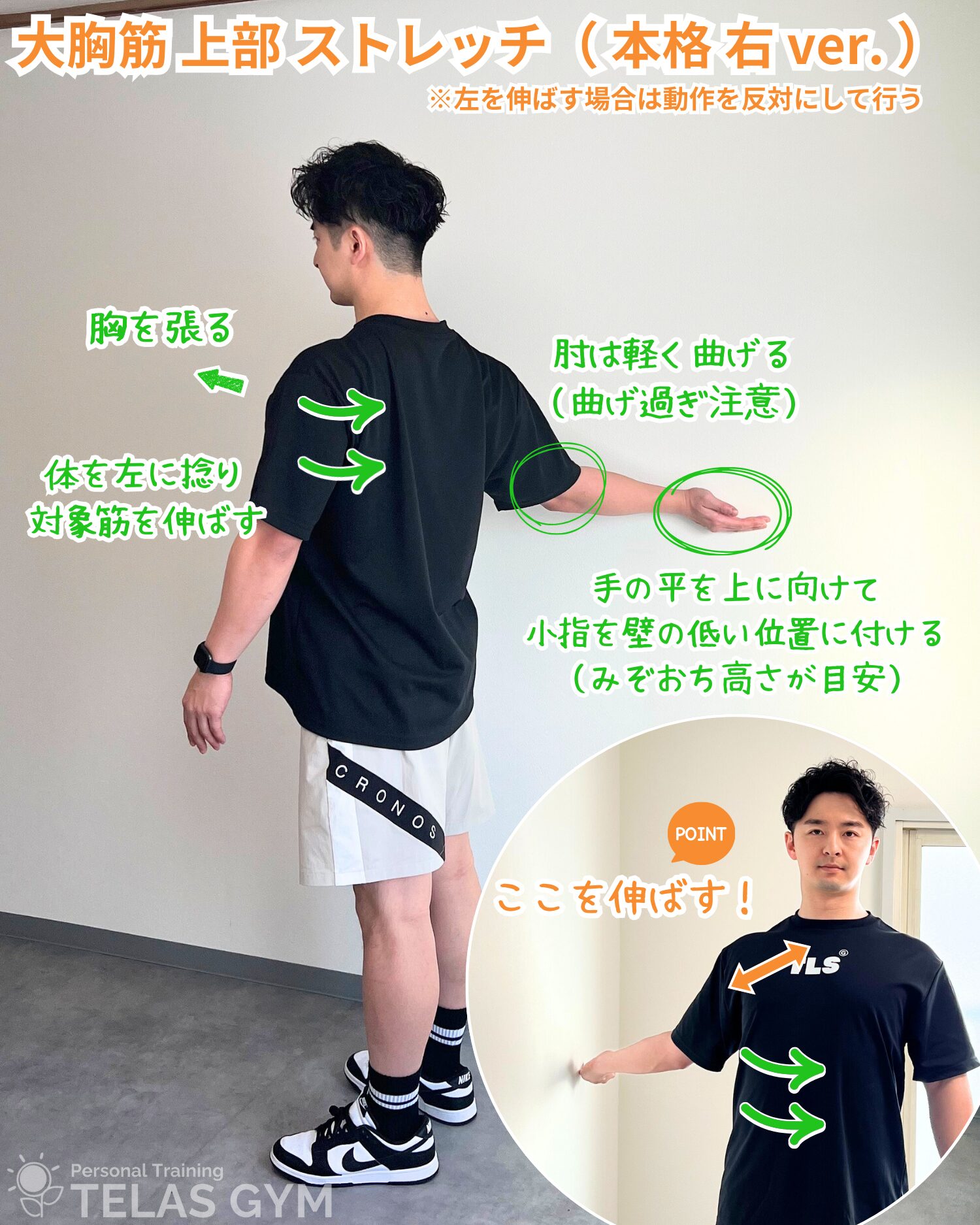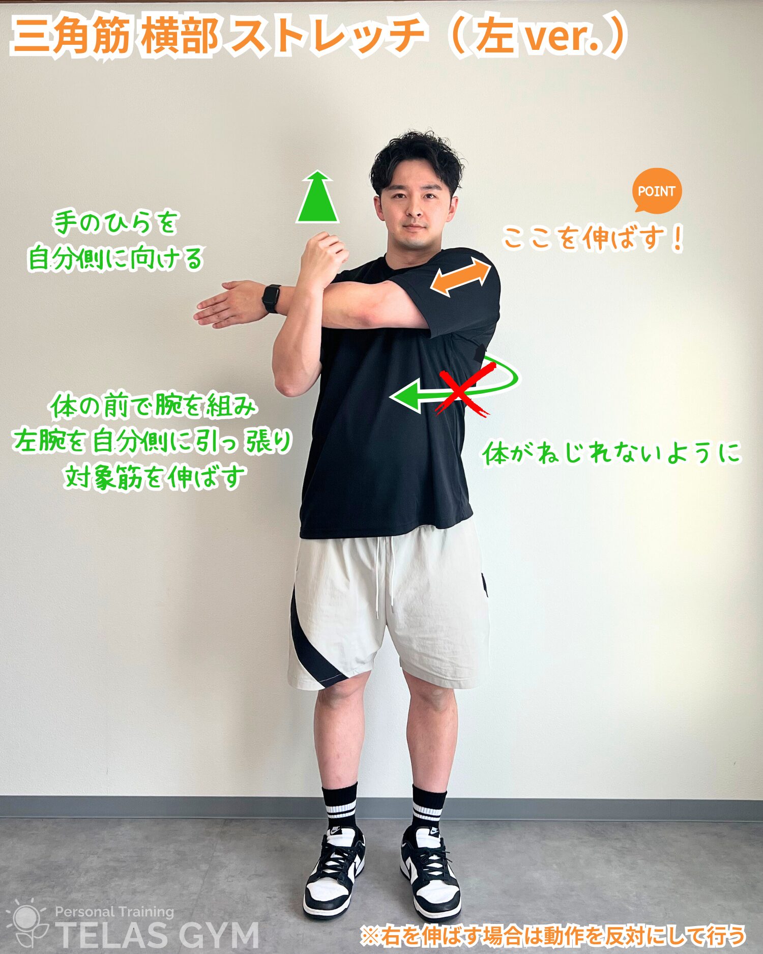 ※テラスジムでトレーニング前に行うストレッチは、対象筋のトレーニング効率を最大化するため、拮抗筋や邪魔な筋肉をしっかり緩めることが目的であるため、その限りではありません。