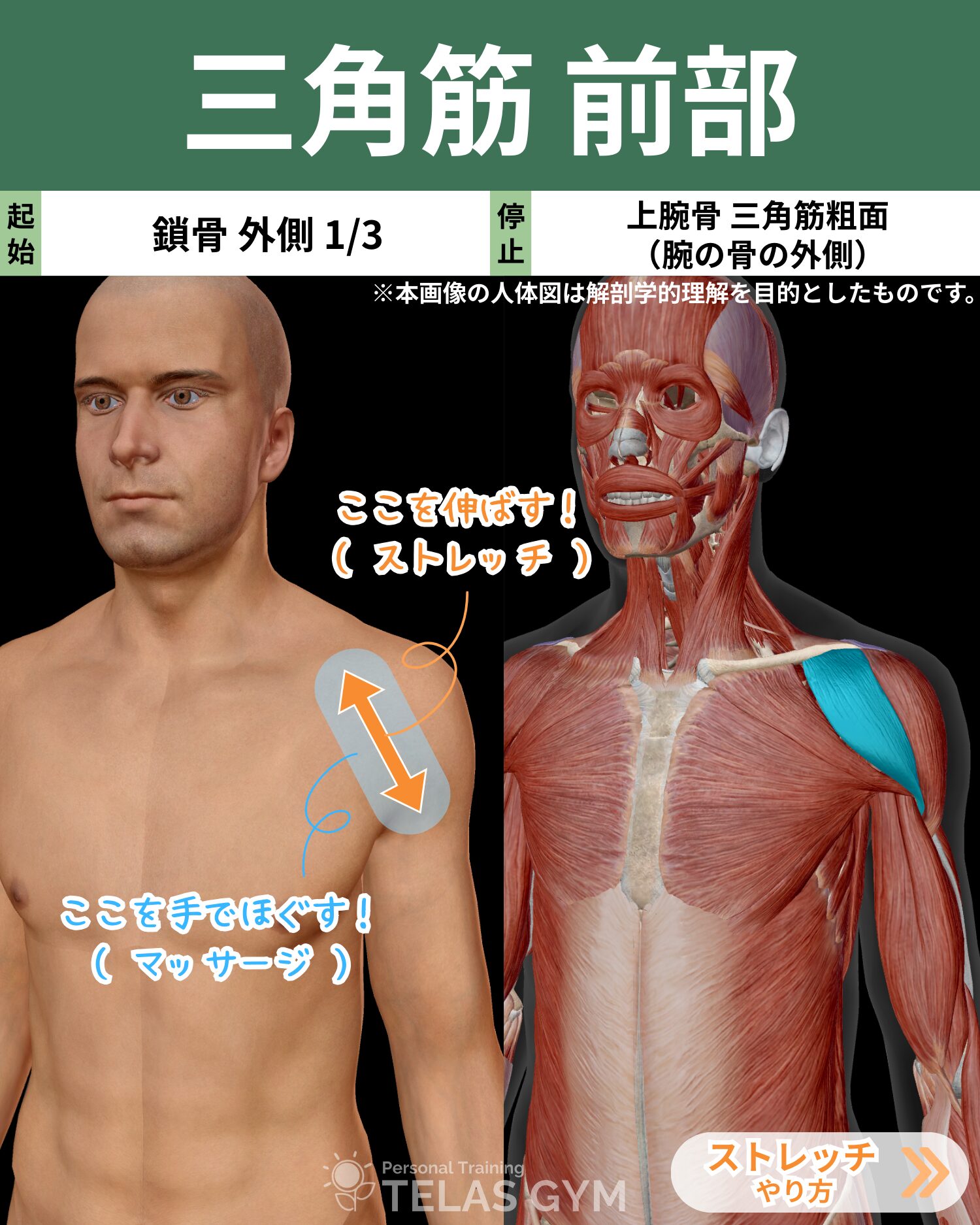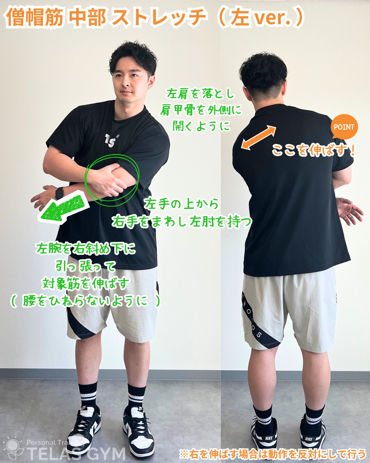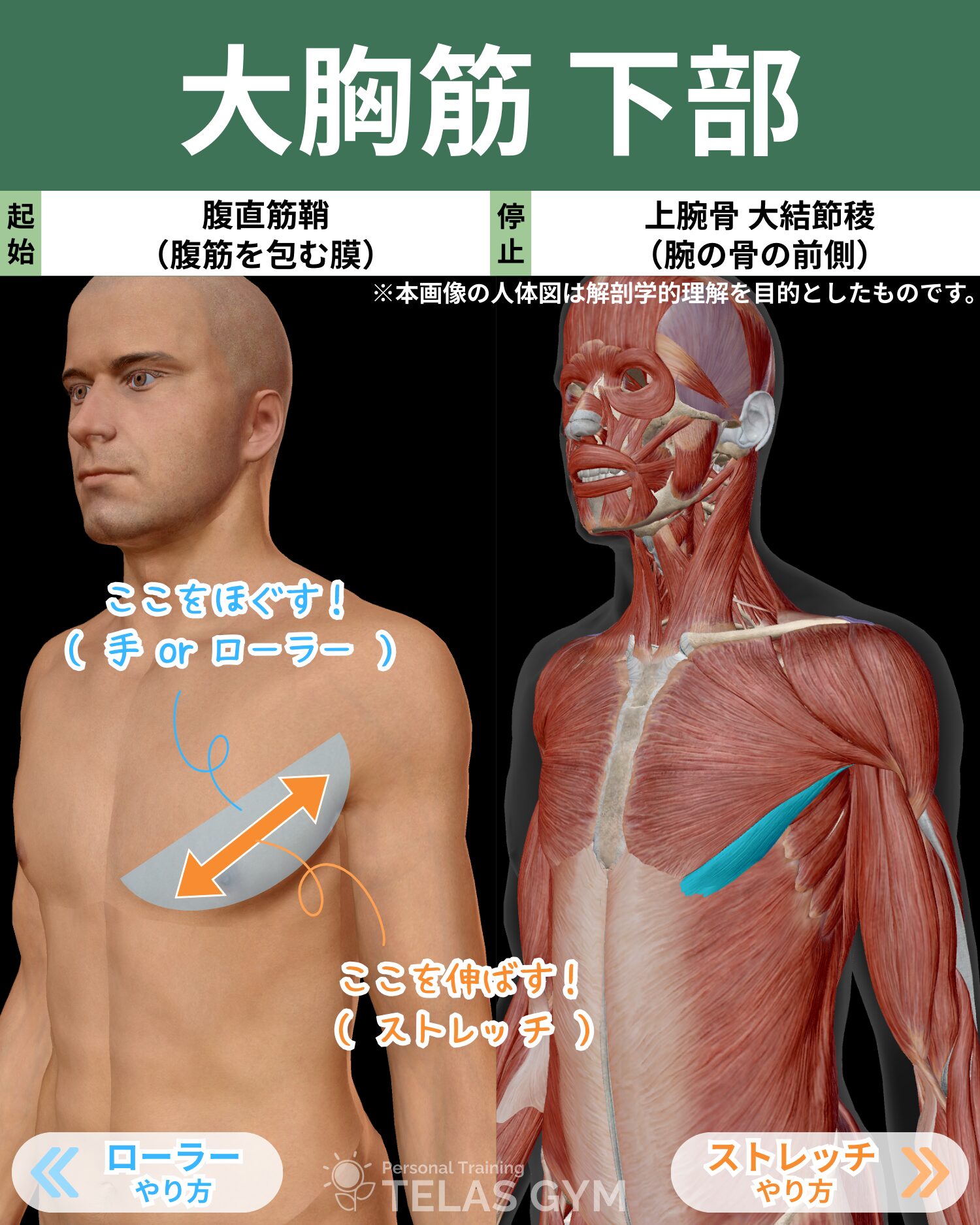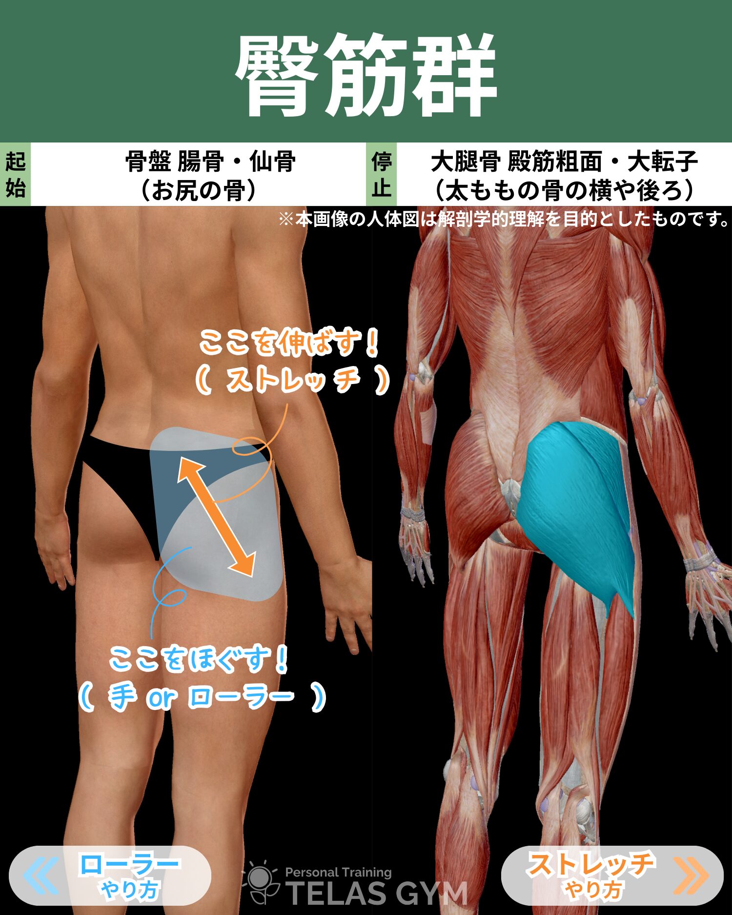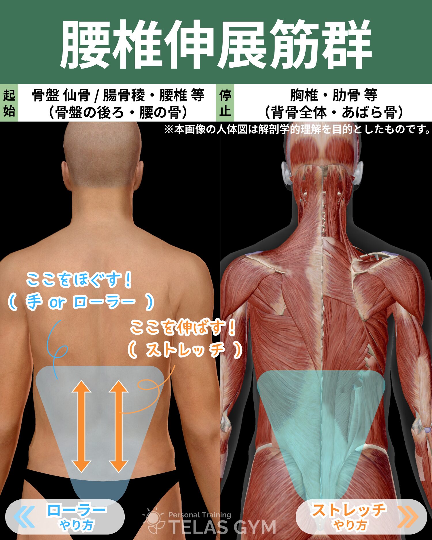 ※テラスジムでトレーニング前に行うストレッチは、対象筋のトレーニング効率を最大化するため、拮抗筋や邪魔な筋肉をしっかり緩めることが目的であるため、その限りではありません。